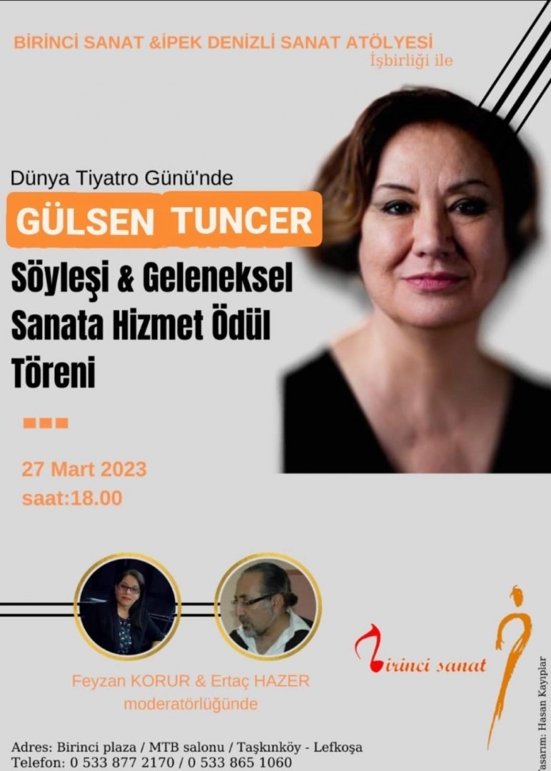 Türk tiyatro, dizi, sinema oyuncusu, seslendirme sanatçısı, söz yazarı, besteci, sanat yönetmeni ve akademisyen  Gülsen Tuncer 27 Mart Dünya Tiyatro Günü vesilesi ile Kıbrıs’a geliyor.