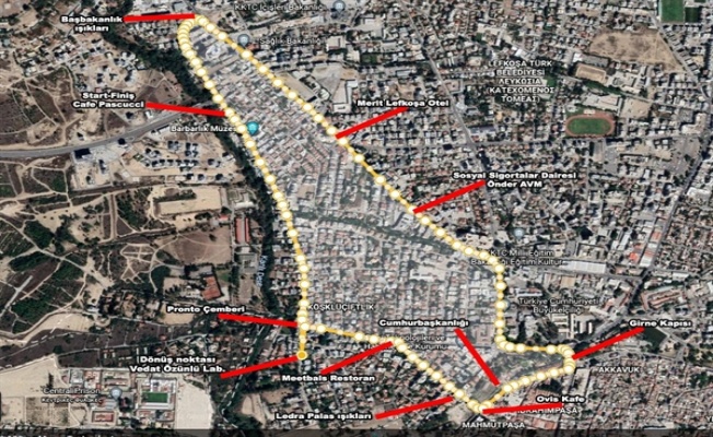 Yarışmacıların Girne Kapısı’ndan sola Cemal Gürsel Caddesi’ne dönerek Şehitler Abidesi’nin bulunduğu çemberden sağa Bedrettin Demirel Caddesine dönecek ve KKTC Cumhuriyet Meclisi önünden kuzey istikametine doğru devam edip, Özgürlük Anıtı’nın bulunduğu çemberden sola döneceği; Merit Hotel önündeki trafik ışıklarından düz geçip Başbakanlık trafik ışıklarına gelecek yarışmacıların daha sonra sola Mehmet Akif Caddesi’ne dönüp yol koşusunun başlangıç noktası olan Cafe Pascucci önüne gelerek yarışı tamamlayacağı kaydedildi.