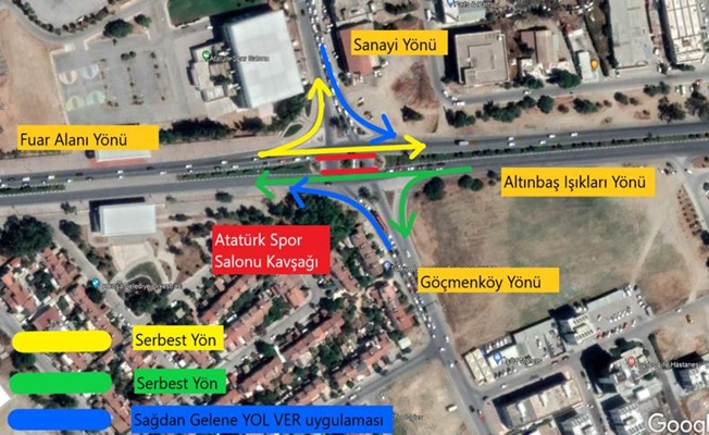 Göçmenköy yönünden kavşağa gelen sürücüler için, sağa dönüşler ve düz gidişler (Sanayi Yönüne ve Alpet Işıkları Yönüne) çalışma boyunca kapalı olacaktır. Sola dönüşler (Fuar Alanı Yönüne) sağdan gelene YOL VER şeklinde serbest olacak.”