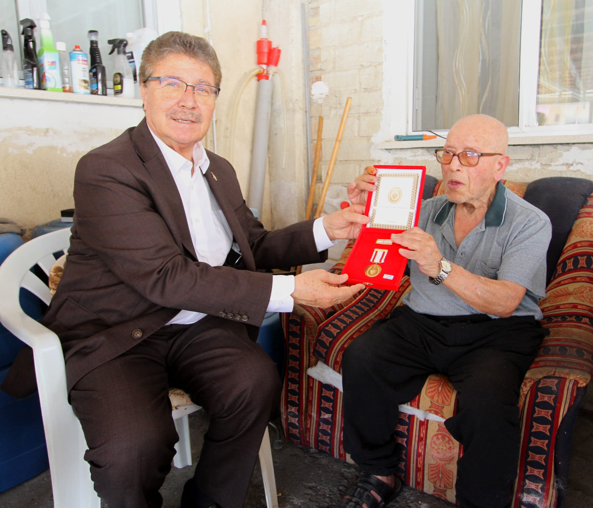 Başbakan Üstel, Hasan Turgut’a ve Karahasan’ın eşi Kadriye Karahasan’a Mücahitlik Madalyalarını takdim etti.