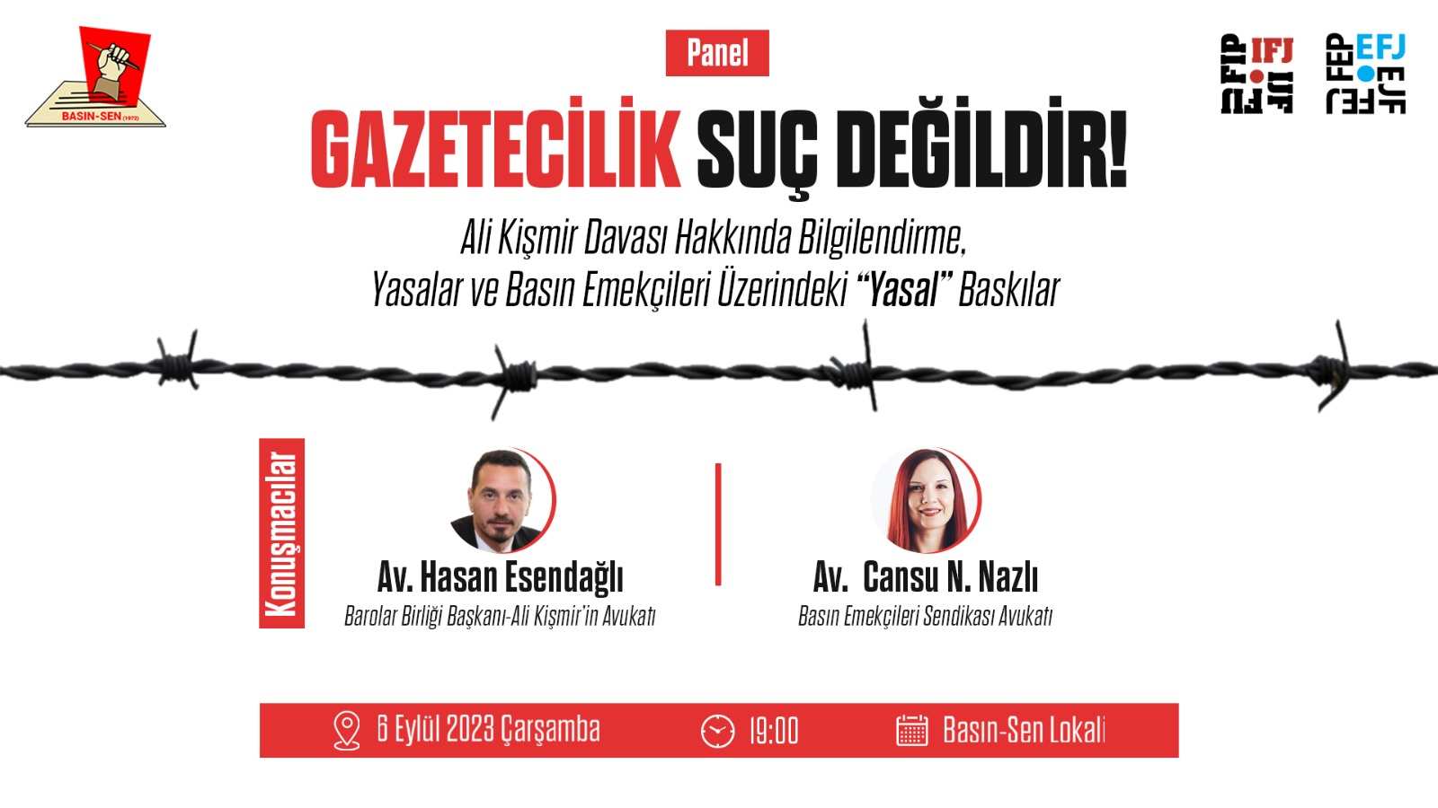 Basın-Sen Lokali’nde yapılacak panele konuşmacı olarak Barolar Birliği Başkanı Hasan Esendağlı ve Basın Emekçileri Sendikası Avukatı Cansu N. Nazlı katılacak. Panel saat 19.00’da başlayacak.