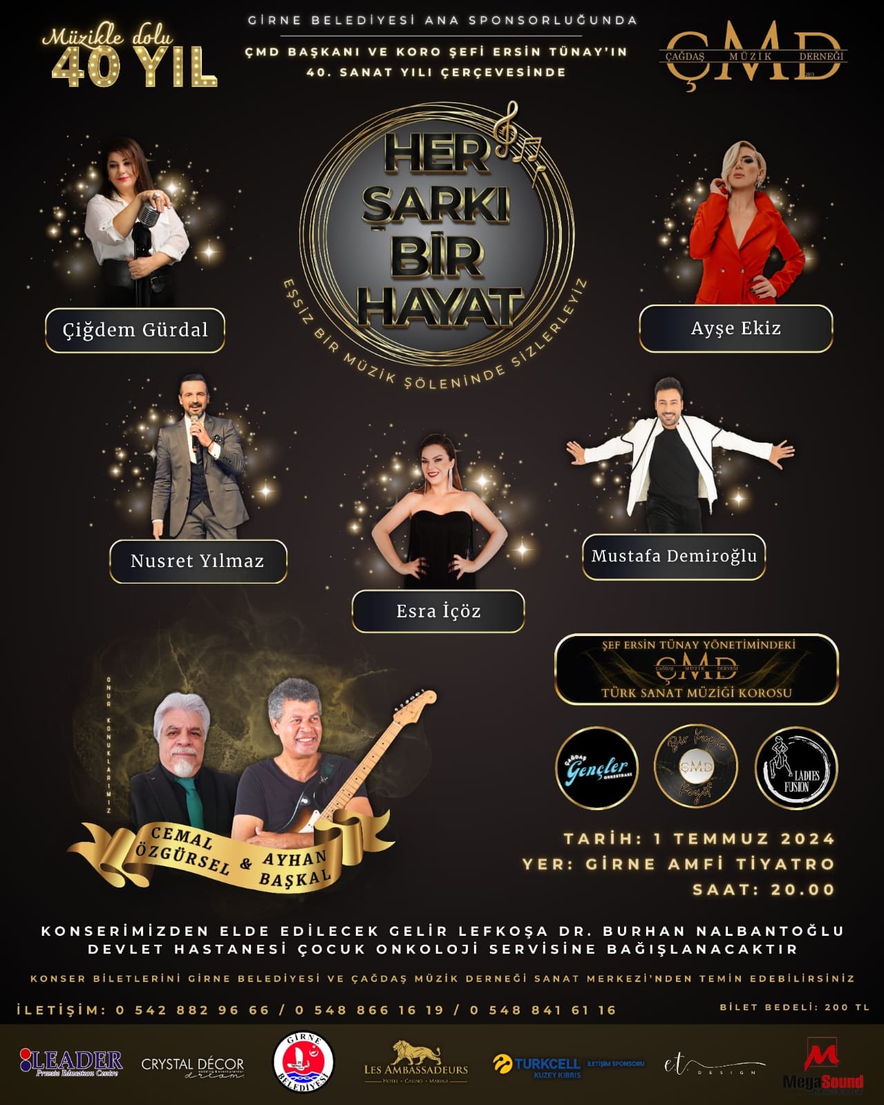Dernek’ten verilen bilgiye göre, Dernek Başkanı ve Koro Şefi Ersin Tünay’ın 40. sanat yılı nedeniyle düzenlenecek konser 1 Temmuz Pazartesi akşamı saat 20.00’de Girne Amfi Tiyatro’da yer alacak.