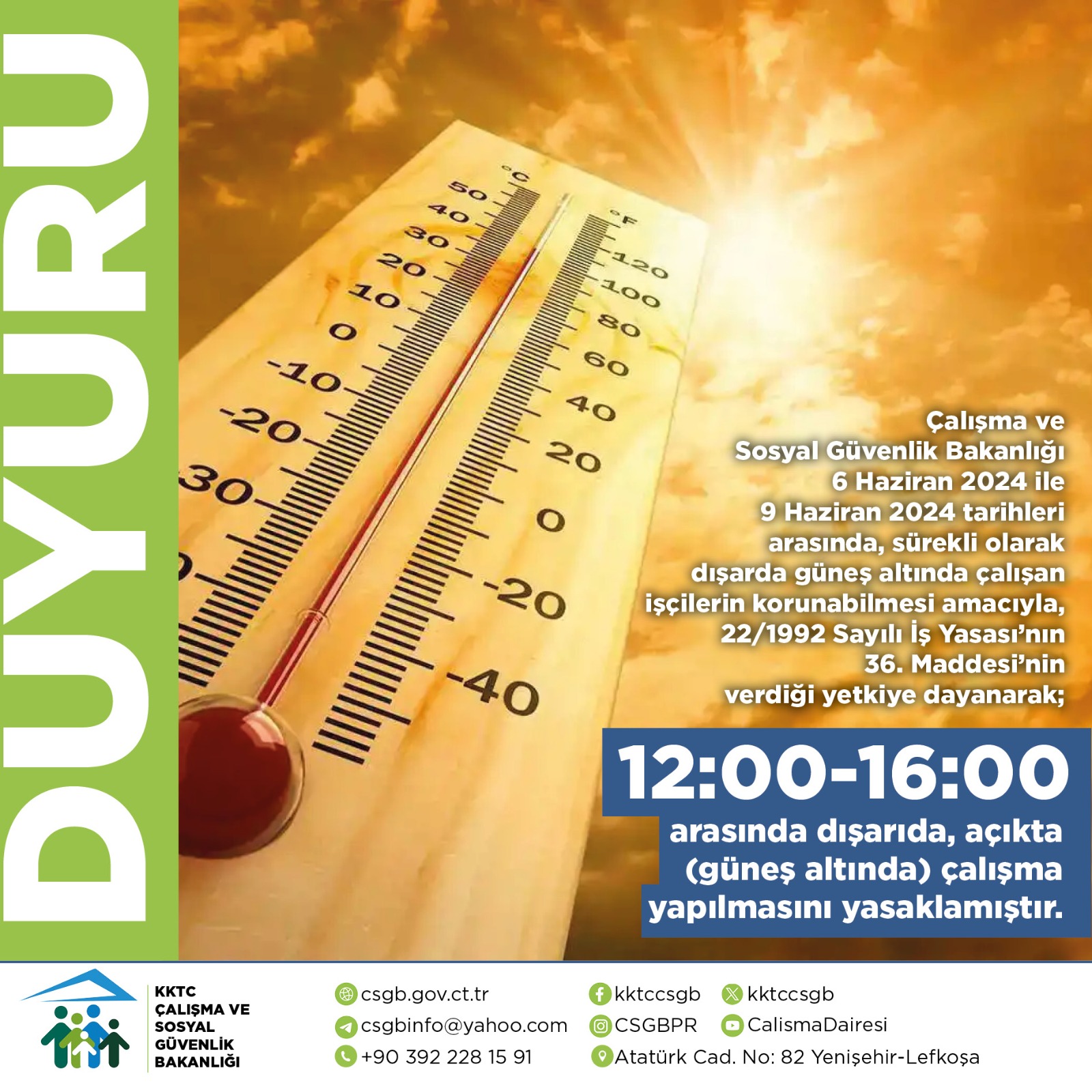 Buna göre, 6 – 9 Haziran tarihleri arasında sürekli olarak dışarda güneş altında çalışan işçilerin korunabilmesi amacıyla “22/1992 Sayılı İş Yasasının 36. Maddesi”nin Çalışma ve Sosyal Güvenlik Bakanlığı’na verdiği yetkiye dayanarak, saat 12.00 ile 16.00 arasında dışarıda, açıkta, güneş altında çalışma yapılmasını yasaklayan bakanlık, şunları kaydetti: