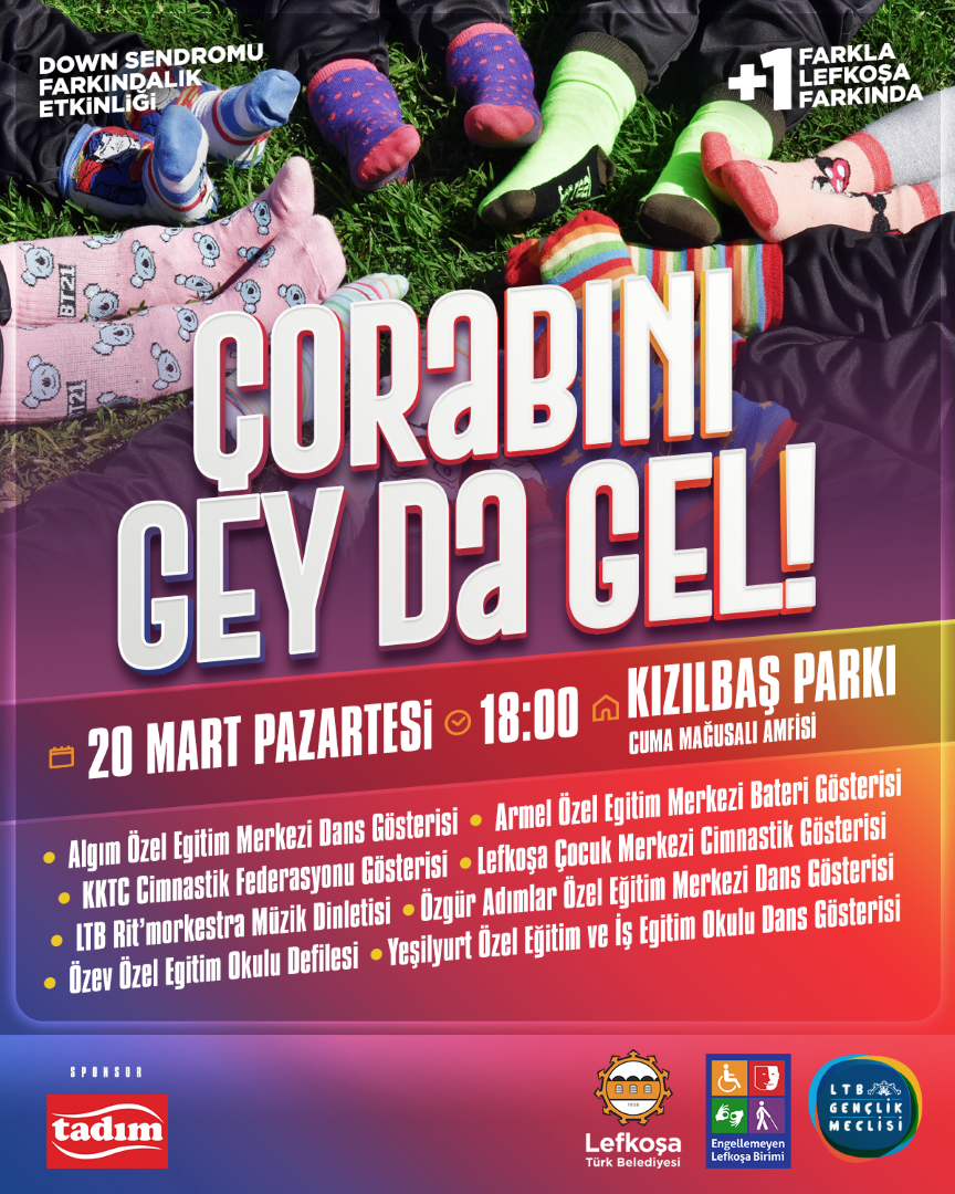 Lefkoşa Türk Belediyesi’nin “+1Farkla Lefkoşa Farkında” sloganı ile Dünya Down Sendromu Günü’nde geleneksel olarak düzenlediği “Çorabını Gey da Gel” etkinliği yarın Kızılbaş Parkı’nda yapılıyor.