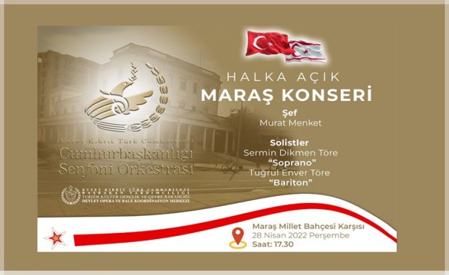 Cumhurbaşkanlığı Senfoni Orkestrası (KKTC CSO), Başbakan Yardımcılığı Turizm, Kültür, Gençlik ve Çevre Bakanlığı Devlet Opera ve Bale Koordinasyon Merkezi ve Güvenlik Kuvvetleri Komutanlığı iş birliğiyle 28 Nisan Perşembe, saat 17.30’da, Maraş Millet Bahçesi karşısında halka açık konser düzenleyecek.