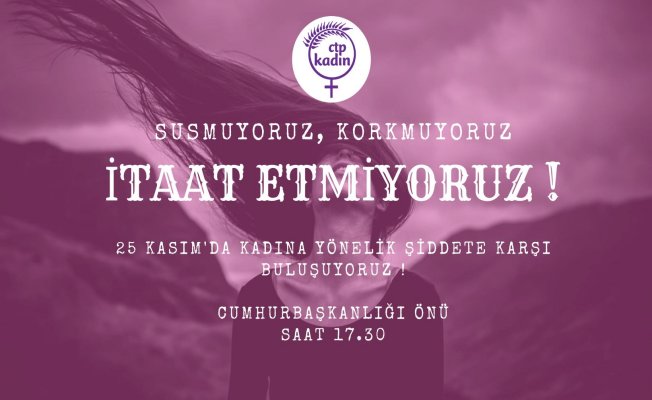 CTP Kadın Örgütü’nden yapılan açıklamada, “25 Kasım Kadına Yönelik Şiddetle Mücadele Günü’nde giderek derinleşen yoksullaşmaya, her geçen gün artan şiddete ve toplumsal irademize yapılan müdahalelere karşı saat 17.30’da Cumhurbaşkanlığı önünde buluşuyoruz” ifadelerine yer verildi.