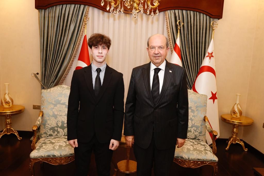 Cumhurbaşkanı Ersin Tatar, IGSCE (General Certificate of Secondary Education) sınavlarının tümünden en yüksek notları alarak üstün başarı gösteren American Academy Nicosia öğrencisi Özkan Cansu ve ailesini kabul etti.
