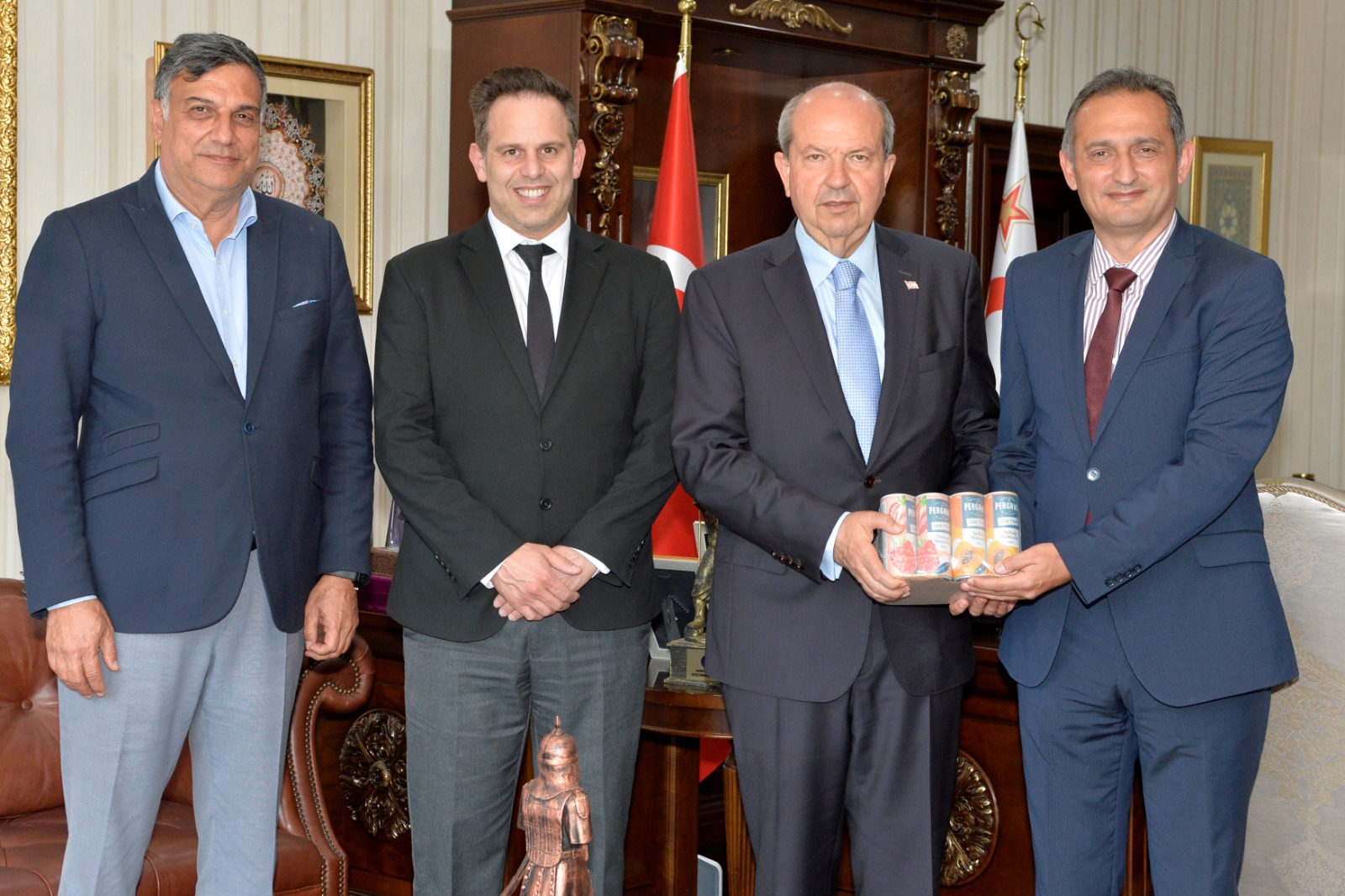 Cumhurbaşkanı Ersin Tatar, Ektam Kıbrıs Ltd. Genel Müdürü Egemen Erdoğan, Direktör Kemal Şentürkler ve eski Beyarmudu Belediye Başkanı İlker Edip’i birlikte kabul etti.