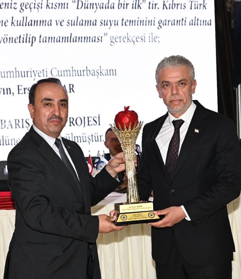 Cumhurbaşkanı Ersin Tatar’a, Türk Dünyası Mühendisler ve Mimarlar Birliği tarafından “Türk Dünyası Mühendisler ve Mimarlar Birliği Onursal Başkanlığı” ve Kıbrıs Barış Suyu Projesi’ne katkılarından dolayı “Kızıl Elma Türk Dünyası Üstün Hizmet Ödülü” verildi.