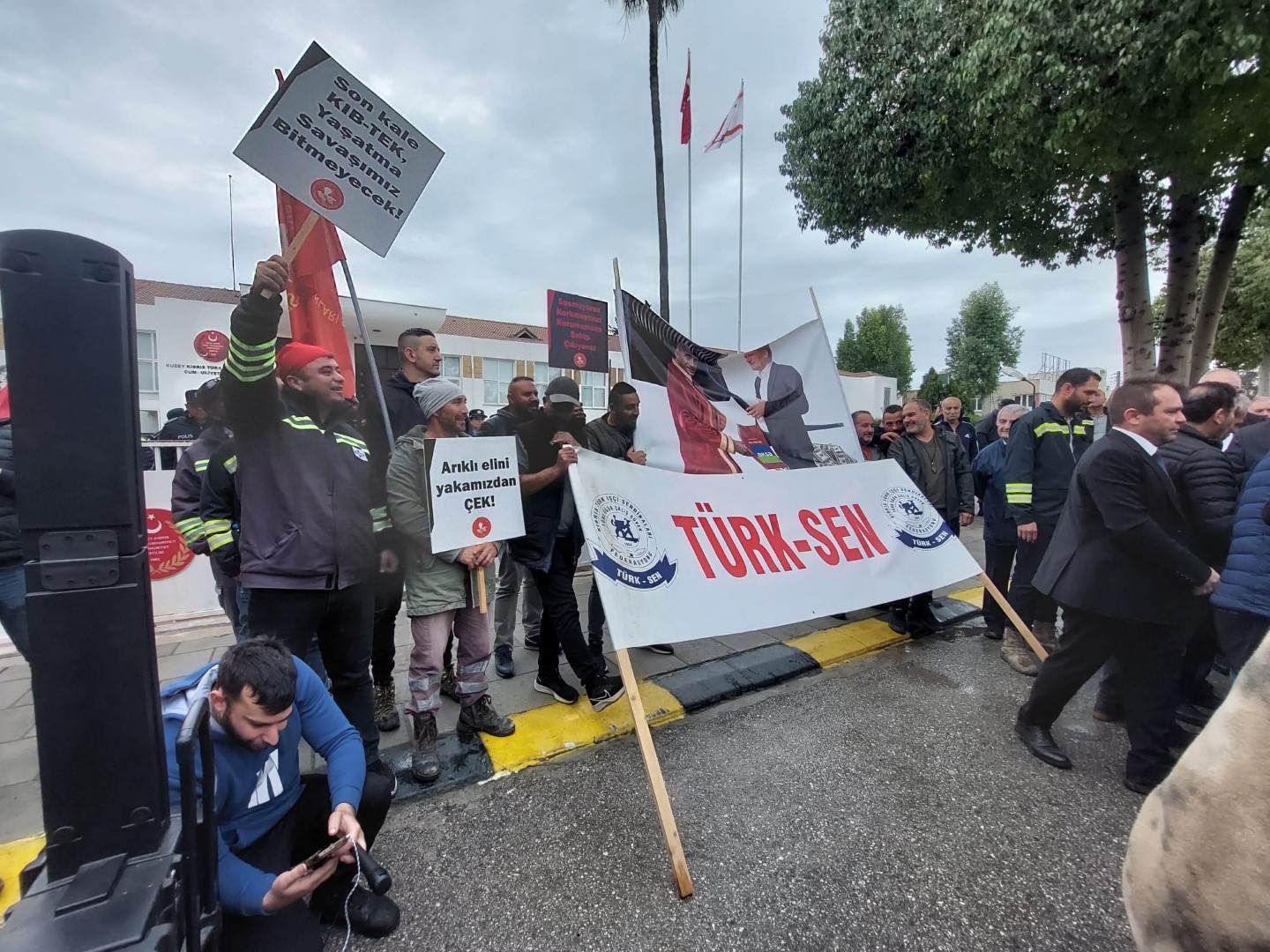 Bugün tüm bölgelerde uyarı grevi yapan El-Sen yetkilileri ve üyeleri, saat 09.00’da Kıb-Tek Merkez binası önünde toplanarak Meclis önüne yürüdü. El-Sen üyeleri Meclis önünde “Alım garantili anlaşmalara hayır” yazılı pankart açtı; “Bu kurumu size yedirmeyiz”, “Susmuyoruz, korkmuyoruz, kurumumuza sahip çıkıyoruz”, “Arıklı elini yakamızdan çek”, “Kıb-Tek özelleştirilemez”, “Son kale Kıb-Tek, yaşatma savaşımız bitmeyecek”, “Evine dön AKSA”, “Sattırmayacağız” yazılı dövizler taşıdı.