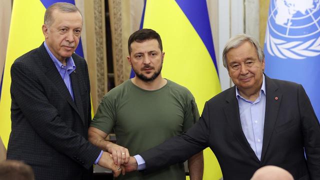 TC Cumhurbaşkanı Recep Tayyip Erdoğan, Ukrayna Devlet Başkanı Vladimir Zelenskiy ve Birleşmiş Milletler (BM) Genel Sekreteri Antonio Guterres, Potoçki Sarayı’nda üçlü zirvenin ardından ortak basın toplantısı düzenledi.