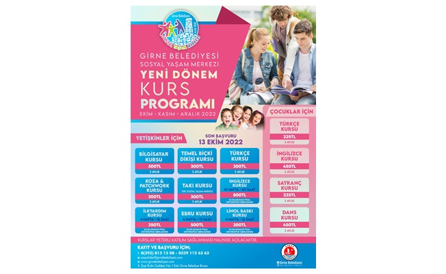 Girne Belediyesi Sosyal Yaşam Merkezi’nde (Eski Girne Belediye Hizmet Binası); yeni dönem kurs kayıtlarına başlandı.