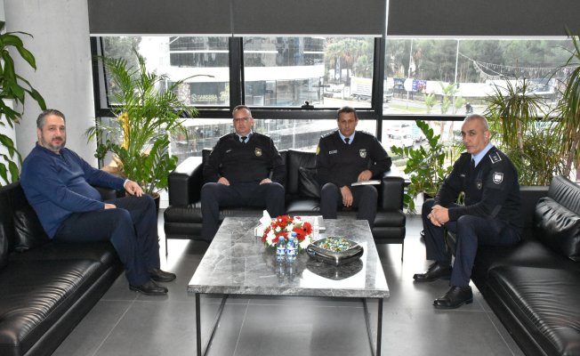 Girne Polis Müdürü Gökay Karagil, Girne Trafik Şube Amiri Mehmet Şençay ve Girne Trafik Devriyeler Amiri Salih Koyutürk ile birlikte Girne Belediye Başkanı Murat Şenkul’ı z,uaret etti.