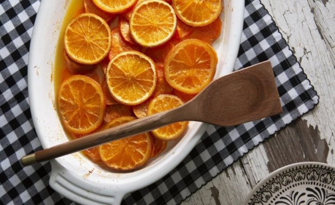 - Ardından üzerine portakal suyu ve limon sıkın. Dilerseniz portakalları yuvarlak şekilde kesip üzerine de yerleştirebilirsiniz.