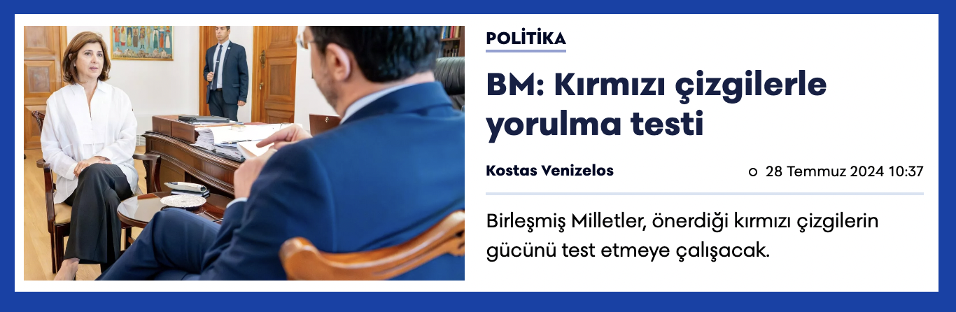 Fileleftheros, “BM’den Dikenli Yönlerde Güç Testi” başlıklı haberinde, BM Genel Sekreteri Antonio Guterres’in, eylül ayına kadar “prosedürel araç olacak” bir belge hazırlama emri verdiği Kişisel Temsilcisi Maria Angela Holguin’in bütün müdahiller ile direkt irtibat halinde bulunduğunu yazdı.
