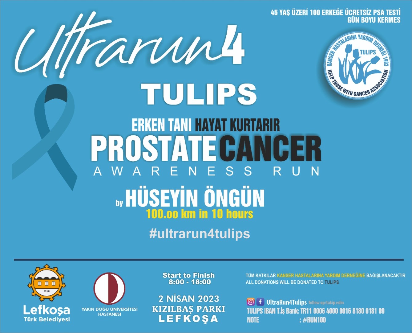 Prostat kanserine dikkat çekmek amacıyla Lefkoşa Türk Belediyesi, Kanser Hastalarına Yardım Derneği ve Yakın Doğu Üniversitesi Hastanesi iş birliğinde 2 Nisan Pazar günü Kızılbaş Parkı’nda “UltraRun4Tulips” etkinliği düzenlenecek. Etkinlikte, atlet Hüseyin Öngün, prostat kanserine dikkat çekmek için 100 kilometre koşacak.
