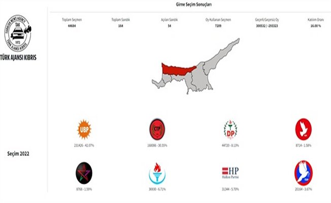 Toplam seçmen sayısının 44 bin 684 olduğu Girne’de 54 sandığa göre oy kullanan seçmen sayısı 7 bin 209. Oyların 300 bin 532’si geçerli.