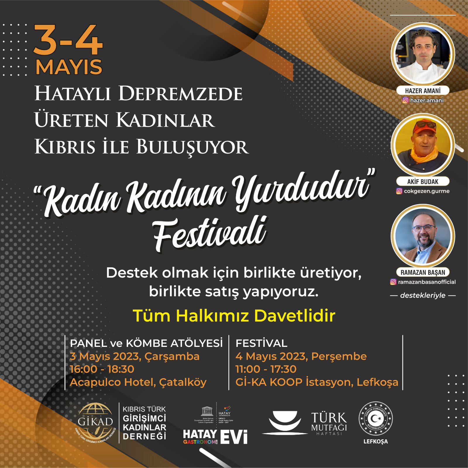 3 Mayıs’ta başlayacak iki günlük etkinliğin ilk gününde Acapulco Hotel’de Panel ve Kömbe Atölyesi gerçekleştirilecek. Festival 4 Mayıs’ta Lefkoşa’da Gİ-KA Koop İstasyon’da devam edecek.