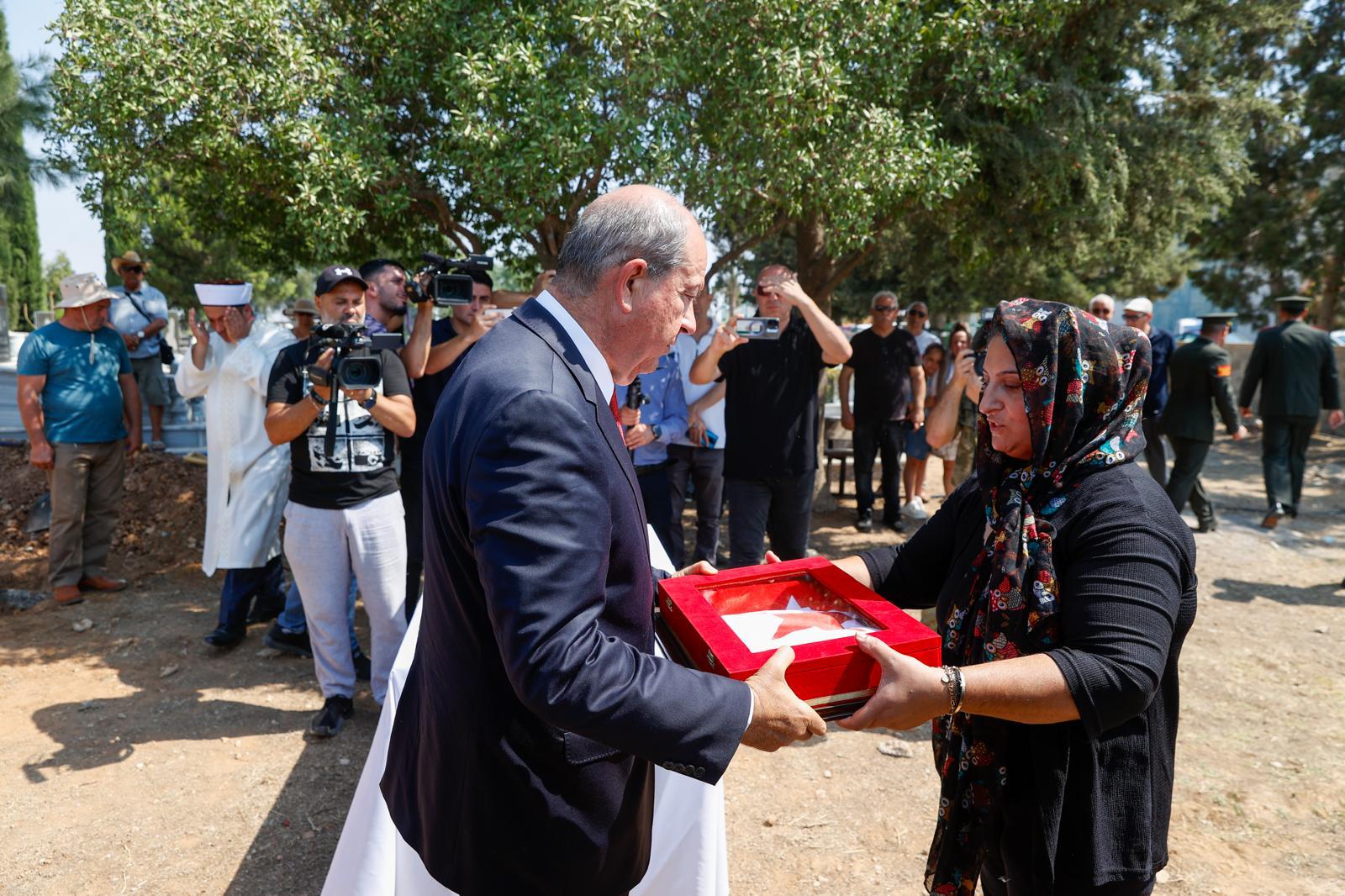 Kılınan cenaze namazının ardından Şehit Eşref Salih’in tabutuna sarılı Türk ve KKTC bayrakları Cumhurbaşkanı Ersin Tatar tarafından Salih’in yakınına teslim edildi.