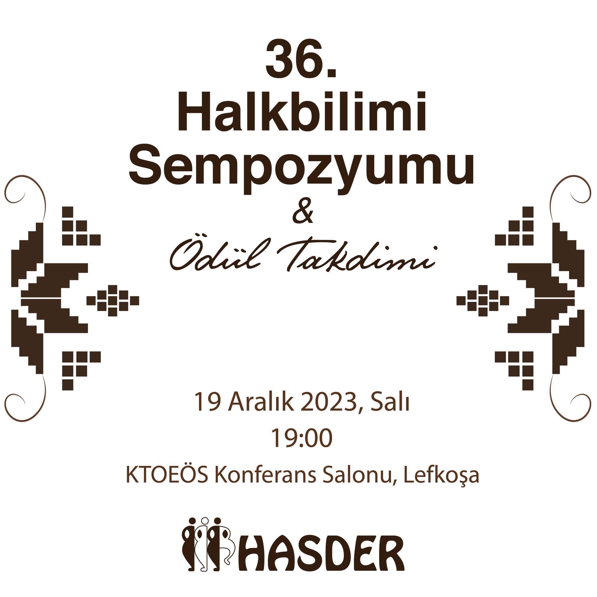 Halk Sanatları Vakfı (HASDER)’den verilen bilgiye göre, Vakıf 1983’ten beri geleneksel olarak gerçekleştirdiği Halkbilimi Sempozyumunun 36’ıncısını 19 Aralık’ta yapıyor. Sempozyum, Kıbrıs Türk Ortaeğitim Öğretmenler Sendikası Konferans salonunda saat saat 19.00’da başlayacak.