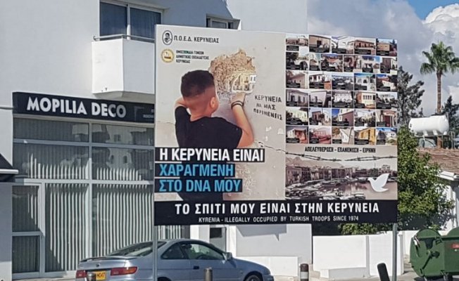 Kıbrıs’ın güneyinde Girne’nin işgal edildiğinin iddia edildiği bir pankart tepki çekiyor.