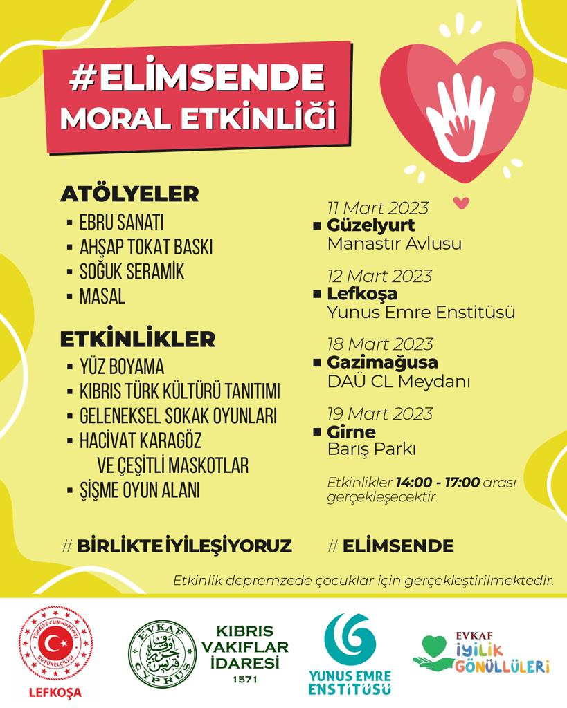 Türkiye’de yaşanan depremin ardından KKTC’deki yakınlarının yanına gelerek yaşama tutunmaya çalışan depremzede çocukların yaralarının sarılması amacıyla “Elim Sende” adıyla kültür-sanat, eğlence içerikli moral etkinliği gerçekleştirilecek.