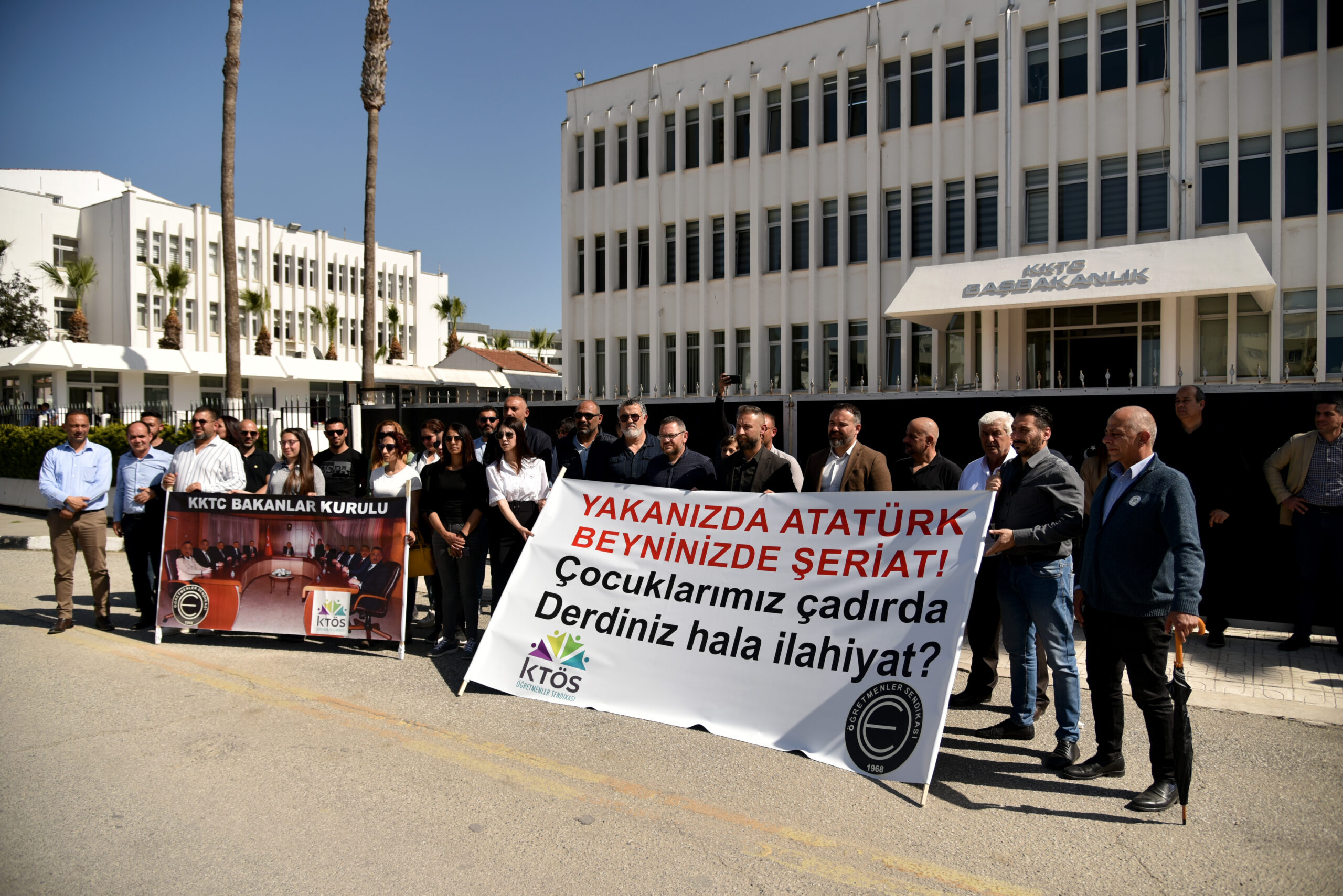 Kıbrıs Türk Öğretmenler Sendikası (KTÖS) ile Kıbrıs Türk Orta Eğitim Öğretmenler Sendikası (KTOEÖS) ekonomik paket içeriğinin gizli tutulduğu ve çadırda eğitim sürerken ilahiyat koleji müjdesi verildiği gerekçesiyle Başbakanlık önünde eylem düzenleyerek, hükümeti protesto etti.