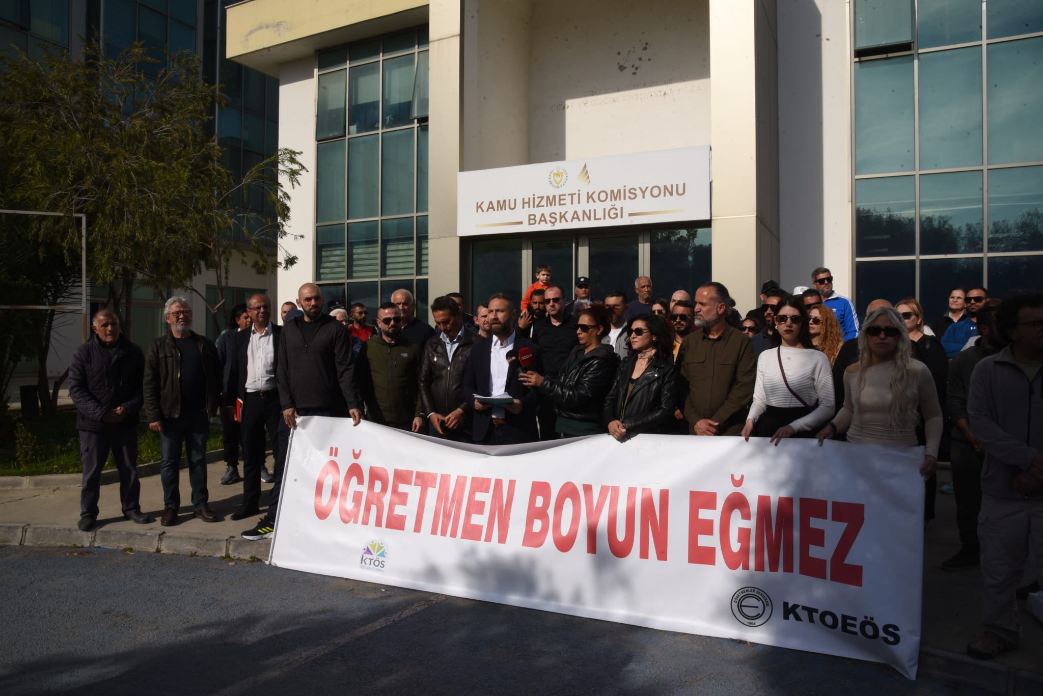 Sendikaların “Öğretmen boyun eğmez” yazılı pankart açtığı eyleme, Cumhuriyetçi Türk Partisi (CTP) Milletvekili Sami Özuslu da katılarak destek verdi.