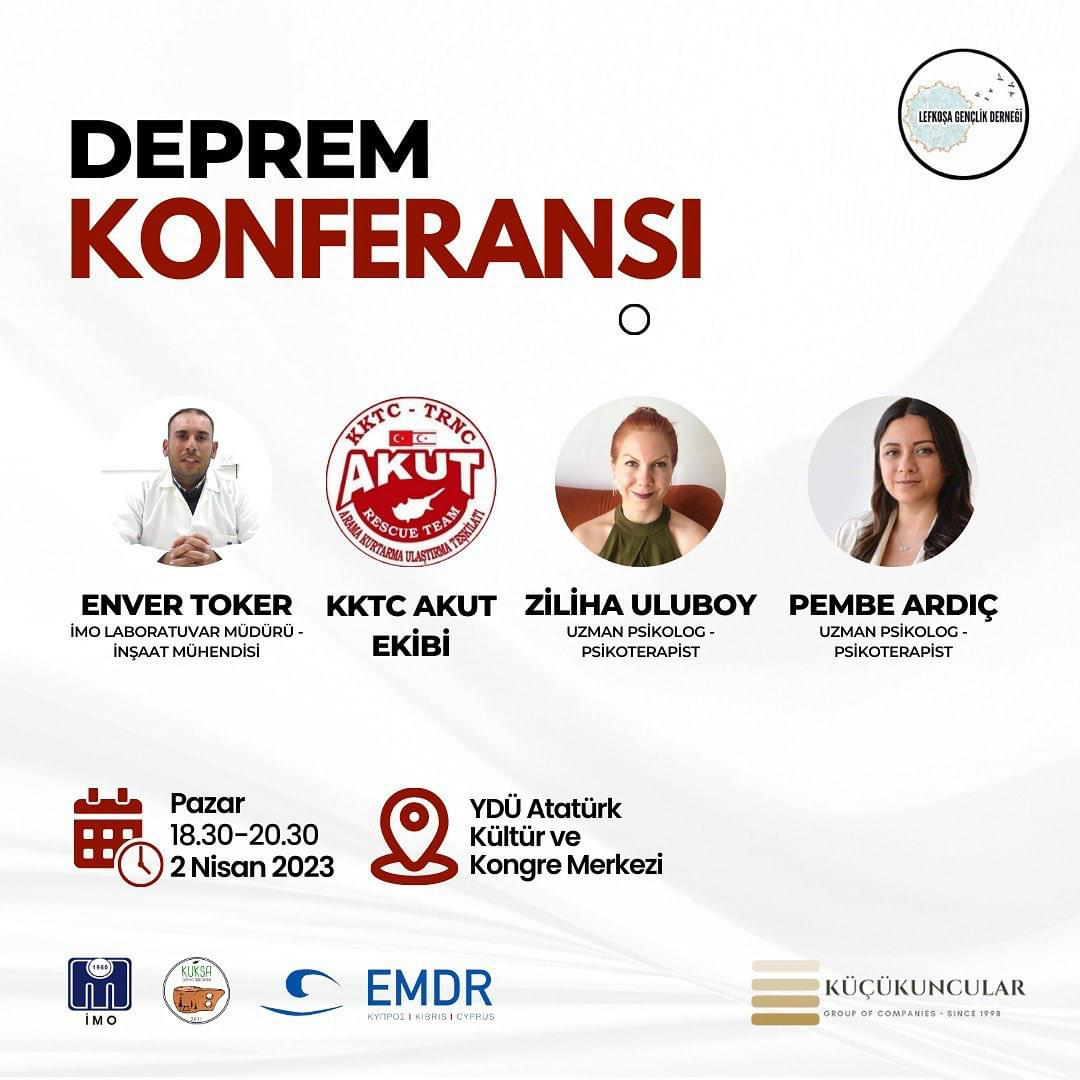 Konferansın konuşmacıları KTMMOB İnşaat Mühendisleri Odası Laboratuvarı Müdürü İnşaat Mühendisi Enver Toker, KKTC AKUT Derneği ekibi ile uzman psikolog ve psikoterapistler Ziliha Uluboy ve Pembe Ardıç olacak.