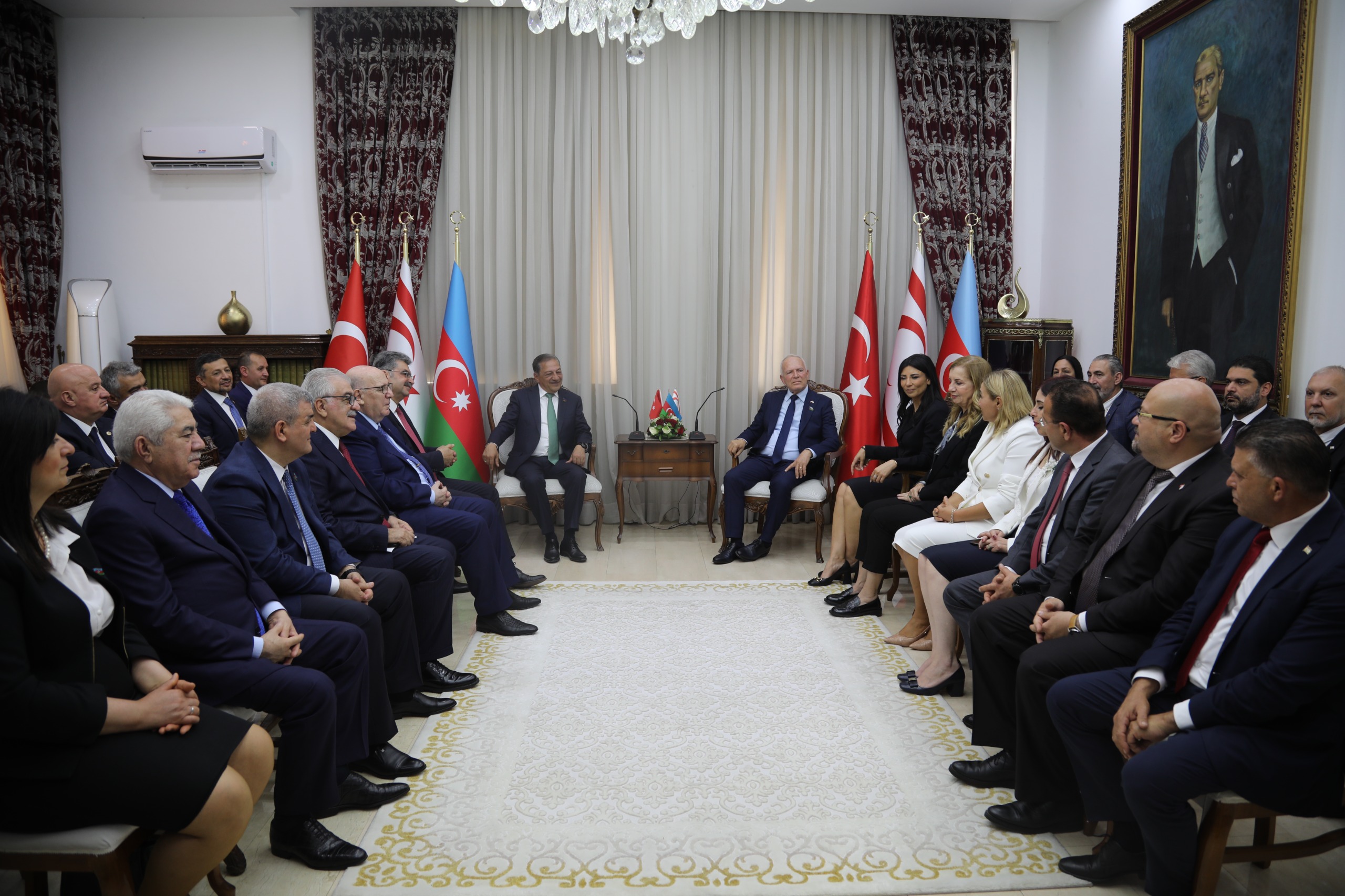 Şeref Salonu’nda gerçekleşen görüşmede, Azerbaycan Milli Meclisi KKTC Parlamentolar Arası Dostluk Grubu Başkanı Cavanşir Feyziyev, Türkiye– Azerbaycan Parlamentolar Arası Dostluk Grubu Başkanı Şamil Ayrım, Türkiye – Parlamentolar Arası Dostluk Grubu Başkanı Orhan Erdem ile Azerbaycan – Türkiye Parlamentolar Arası Dostluk Grubu Başkanı Ehliman Emiraslanov ve beraberlerindeki heyetler ile KKTC Cumhuriyet Meclisi Başkan Yardımcısı Fazilet Özdenefe, Meclis Başkanlık Divanına üye Milletvekilleri ve KKTC-TC Dostluk Grubu heyeti üyeleri yer aldı.
