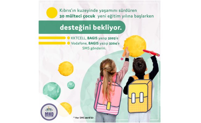 Çocukların okul ödemeleri, kırtasiye ihtiyaçları, özel ders masrafları, üniforma giderleri ve eğitim yılı içerisinde çıkabilecek olan diğer masraflar için başlatılan tek seferlik bağış kampanyasına; Sabit Hat GSM kullanıcıları; KKTCELL kullanıcıları ‘BAGIS’ Yazıp 3203’e SMS göndererek, Vodafone kullanıcıları ‘BAGIS’ Yazıp 3204’e SMS göndererek tek seferlik 20 TL tutarında bağış gerçekleştirebilecek.