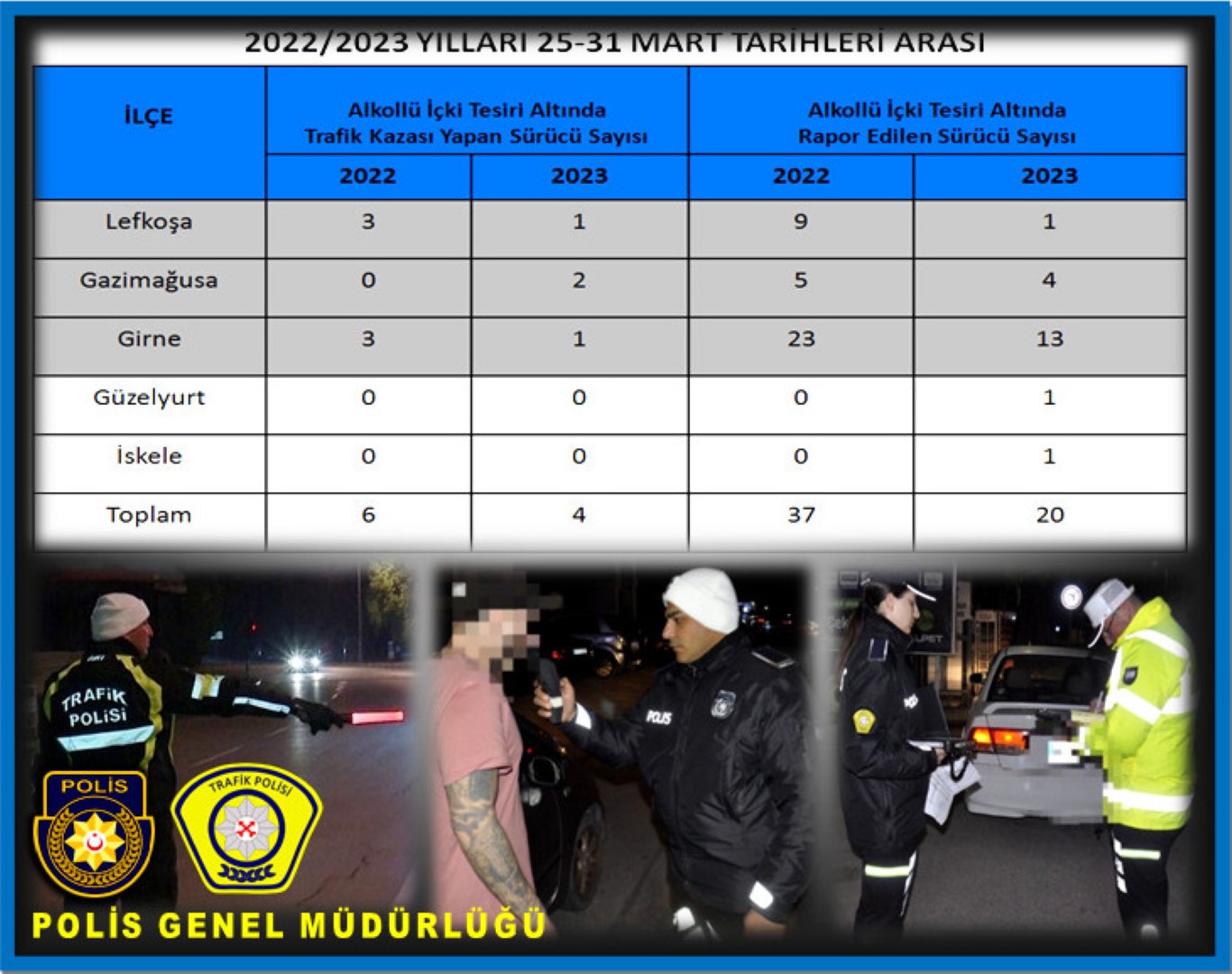 Yine ilçeler bazında, geçen yıl 25-31 Mart tarihlerinde, başkent Lefkoşa’da 9 ve Gazimağusa’da 5, Girne’de 23 sürücü alkollü içki tesiri altında araç kullanıp rapor edilirken, bu sürücülerin sayısı 2023 yılının aynı döneminde, Gazimağusa’da 4 Girne’de 13, Lefkoşa, Güzelyurt ve İskele’de ise birer sürücü olarak kaydedildi.