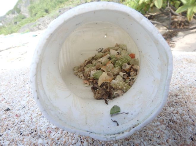 Araştırmacılar adalarda inceledikleri sahillerde kaç tehlikeli şişe ve kutu olduğunu, bunların kaçının içinde hapsolmuş yengeç olduğunu saydı.