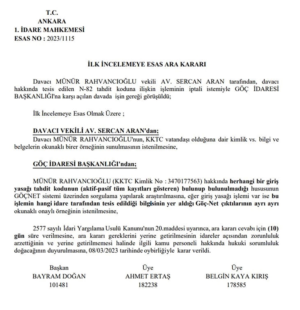 Bağımsızlık Yolu’ndan yapılan açıklamada, T.C. Ankara 1. İdare Mahkemesi’nde Göç İdaresi Başkanlığı aleyhine açılan davada ilk incelemeye esas olmak üzere, Davacı Vekili Avukat Sercan Aran’dan, Davacı Münür Rahvancıoğlu’nun KKTC vatandaşı olduğuna dair kimlik vb. bilgi ve belgelerin birer örneğinin sunulmasının istenmesine karar verildiği kaydedildi.