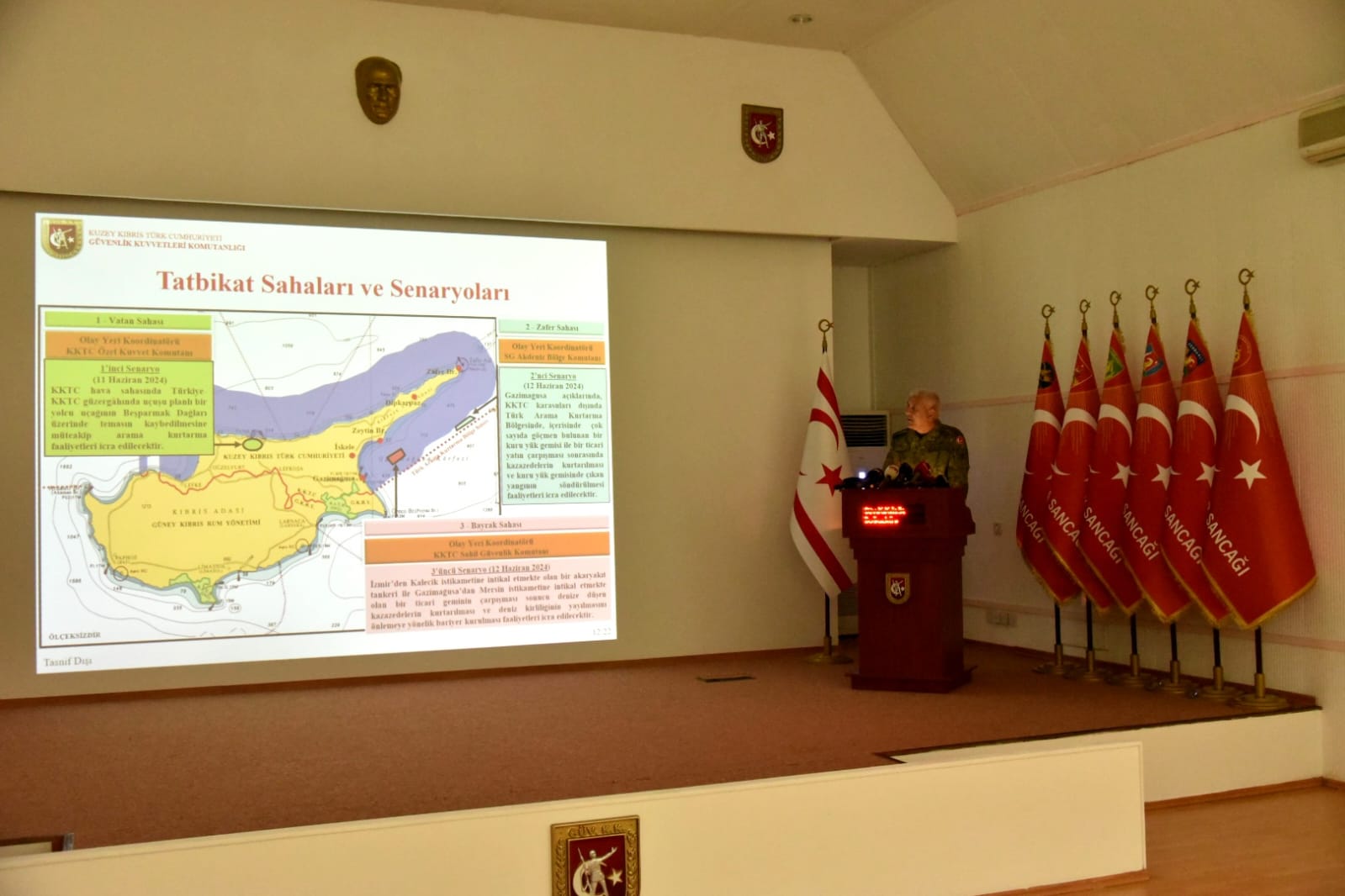 Tatbikatın kara safhasında, KKTC hava sahasında Türkiye-KKTC güzergahında yolcu uçağının Beşparmak dağları üzerinde temasın kaybedilmesiyle arama kurtarma faaliyetlerinin icra edileceğini anlatan Tümgeneral Aytaç, deniz safhasında iki numaralı sahada Gazimağusa açıklarında, KKTC karasuları dışında ancak Türk arama-kurtama bölgesinde içerisinde çok sayıda göçmen bulunan kuru yük gemisiyle, bir ticari yatın çarpışması sonrasında kazazedelerin kurtarılması ve kuru yük gemisinde çıkan yangının söndürülmesi faaliyetleri yapılacağını söyledi.