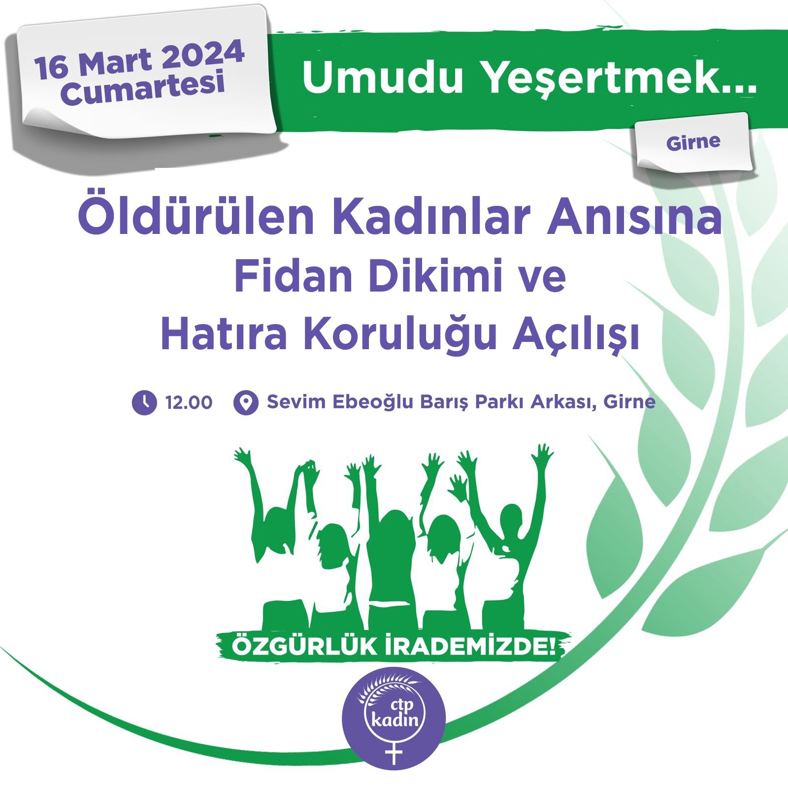 CTP Kadın Örgütü 8 Mart Emekçi Kadınlar Günü Özgürlük İrademizde programı, yarın, CTP Kadın Örgütü Lefkoşa ve Girne İlçelerinin birlikte düzenleyeceği, şiddete maruz kalarak hayatlarını kaybeden kadınlar anısına oluşturulacak fidanlıkta “Umudu Yeşertmek Fidan Dikimi” yapılarak tamamlanacak.