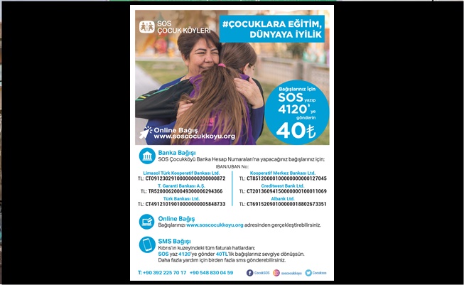Elden Bağış: SOS Çocukköyü Derneği’nin, Lefkoşa Çocukköyü ve Girne Gençlik Evi yerleşkelerini ziyaret ederek elden bağış yapılabiliyor. 0392 225 70 17 – 0548 830 04 59 numaralı telefonlardan veya SOS Çocukköyü Derneği sosyal medya hesaplarından bilgi alınabiliyor.