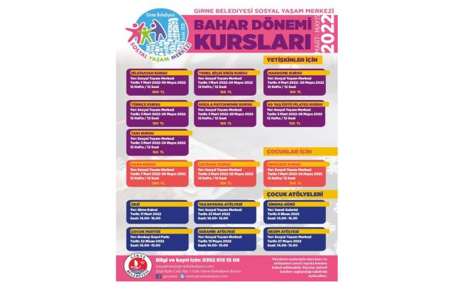 Girne Belediyesi’nden yapılan açıklamada, Sosyal İşler Şubesi’ne bağlı Sosyal Yaşam Merkezi’nde (Eski Girne Belediye Hizmet Binası);Yetişkinler için; Bilgisayar Kursu, Temel Biçki Dikiş Kursu, Koza& Patchwork Kursu, Makrome Kursu, Takı Kursu, 60 Yaş Üstü Pilates Kursu yanında, Türkçe Kursu düzenleniyor. Çocuklar için ise programda, Dans Kursu, İngilizce Kursu ve Satranç Kursu yer alıyor. Program süresince çocuklar için de çeşitli atölyeler düzenlenecek.
