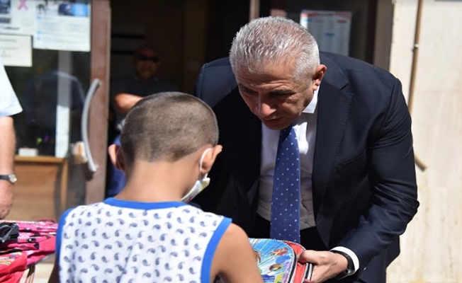 Bakan Taçoy, bu sabah, Sosyal Hizmetler Dairesi Müdürlüğü’nde çocuklara ‘‘İlk Okul Çantam’’ Projesi kapsamında çanta dağıttı.