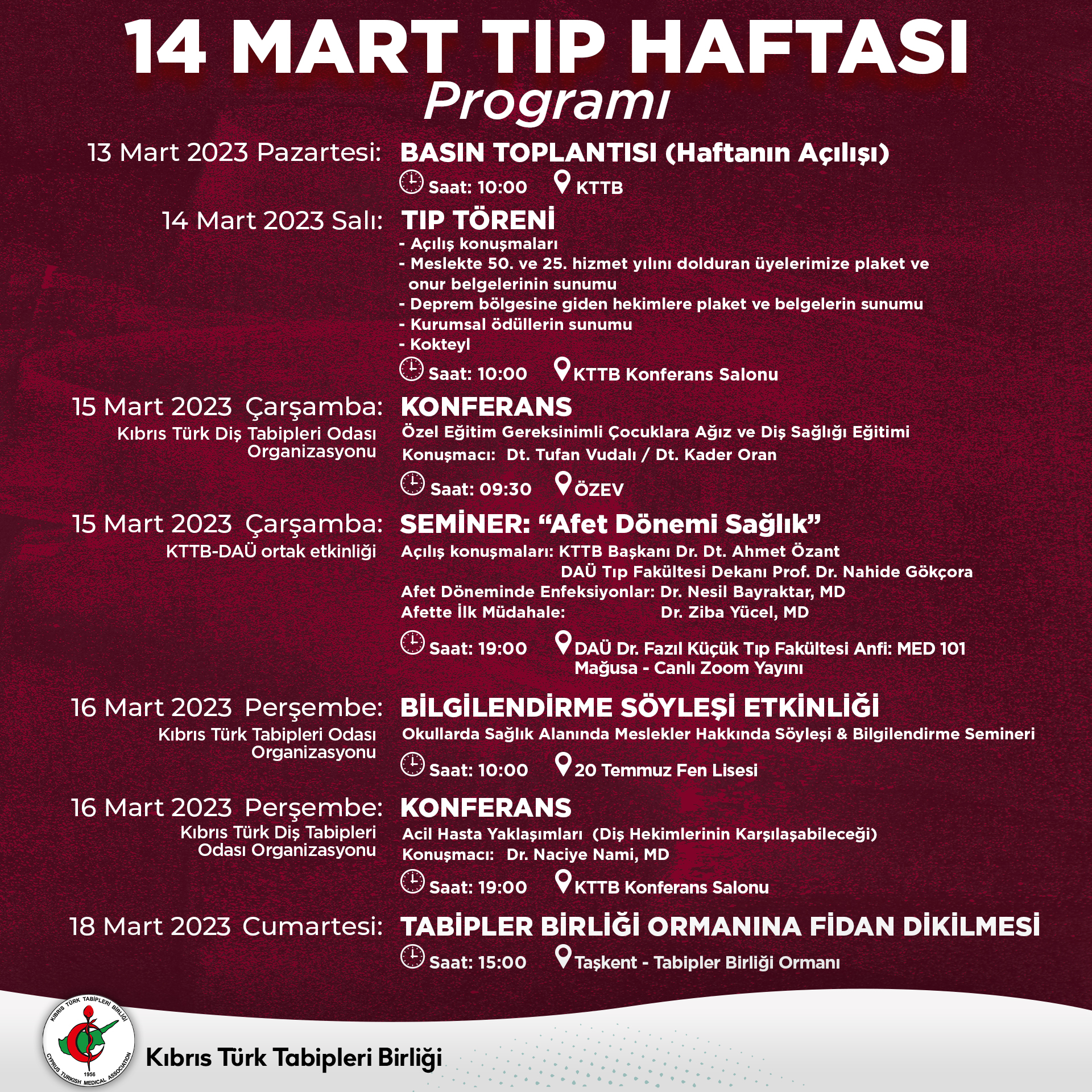 14 Mart Tıp Haftası’nın açılışı; 13 Mart Pazartesi günü saat 10.00’da Kıbrıs Türk Tabipleri Birliği toplantı salonunda düzenlenecek basın toplantısıyla yapılacak. Hafta boyunca, seminerler, konferanslar, söyleşiler düzenlenecek. Etkinlikler, 18 Mart Cumartesi günü Tabipler Birliği Ormanı’na fidan dikilmesiyle sona erecek.