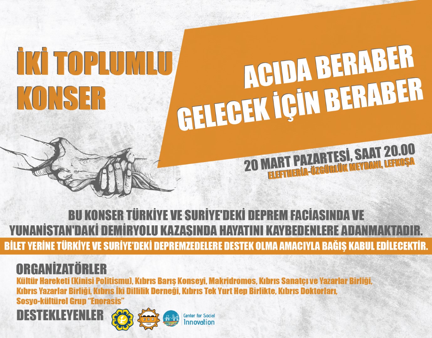 “Acıda Beraber, Gelecek İçin Beraber” başlıklı konser 20 Mart Pazartesi akşamı saat 20:00’de Özgürlük Meydanı’nda (Elefteria) yer alacak.
