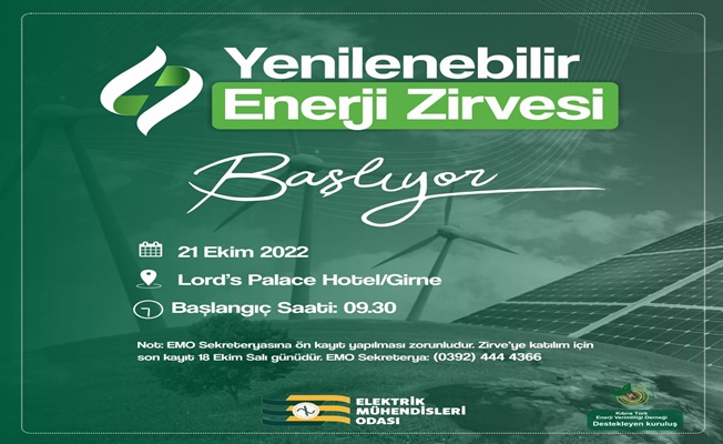 Elektrik Mühendisleri Odası (EMO) tarafından, ülkenin enerji sorununa bütünlükçü ve yapıcı bir çözüm haritası oluşturma amacıyla, 21 Ekim tarihinde “Yenilenebilir Enerji Zirvesi” yapılacak.